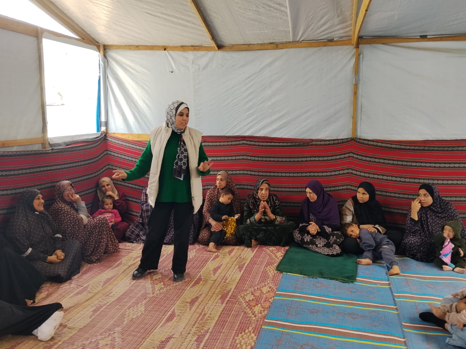 La rencontre a abordé l’une des questions les plus sensibles et les plus marquantes dans leur quotidien : la perte d’intimité à l’intérieur des tentes. Un sentiment invisible, mais qui alourdit chaque détail de la vie. La séance a commencé par une question simple, mais chargée de douleur :« Qu’est-ce qui vous épuise le plus dans la tente ? » L’une des participantes a déclaré : « Le plus difficile n’est pas seulement l’exiguïté de la tente, mais ce sentiment constant d’être exposées en permanence, comme si toute notre vie était à découvert devant les autres, sans aucune véritable barrière. Nous n’avons ni porte à fermer pour nous sentir en sécurité, ni mur pour préserver notre intimité. Juste un morceau de tissu léger qui nous sépare de l’extérieur. Il ne bloque ni les sons ni les regards. Nous avons l’impression de vivre dans un espace ouvert qui ne ressemble en rien à un foyer. »