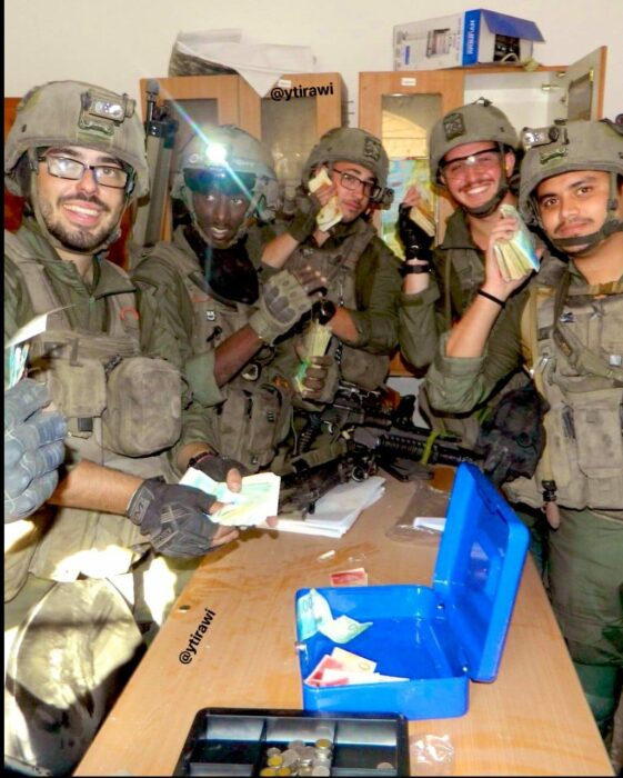L’année dernière, des rapports israéliens ont confirmé que les forces israéliennes se livraient à des pillages lors des invasions du Liban, de Gaza et de la Syrie. Ces pillages étaient si généralisés que les soldats plaisantaient en disant que le poids des objets leur « brisait le dos ». Parmi ces objets figuraient des caisses contenant près de 28 millions de dollars d’argent liquide, des lingots d’or, des bijoux de luxe et 183.000 armes.
