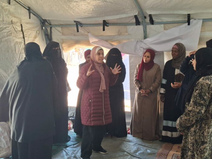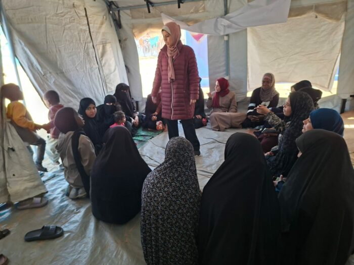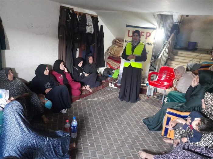 L’équipe de l’UJFP a organisé une séance de soutien psychosocial pour les femmes déplacées dans le camp d’Al-Durra, à l’ouest de Deir al-Balah, dans le but de fournir un espace sûr d’expression et d’alléger les pressions quotidiennes. Vingt femmes vivant dans les tentes du camp ont participé à cette rencontre. Ce rassemblement a permis de raviver l’esprit communautaire fragilisé par le déplacement, tout en renforçant les sentiments de soutien mutuel entre les participantes. Cette séance est intervenue en réponse à une monotonie pesante vécue par les femmes dans le camp, où la journée devient un cycle fermé de tâches épuisantes, dépourvu de toute dimension humaine ou récréative.