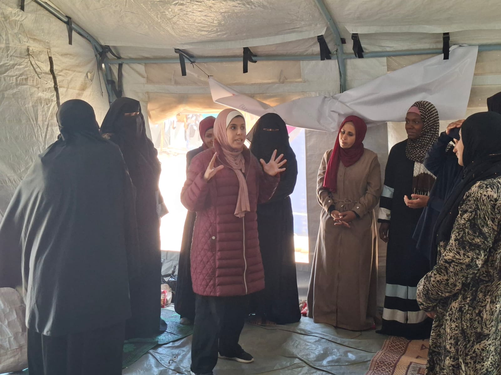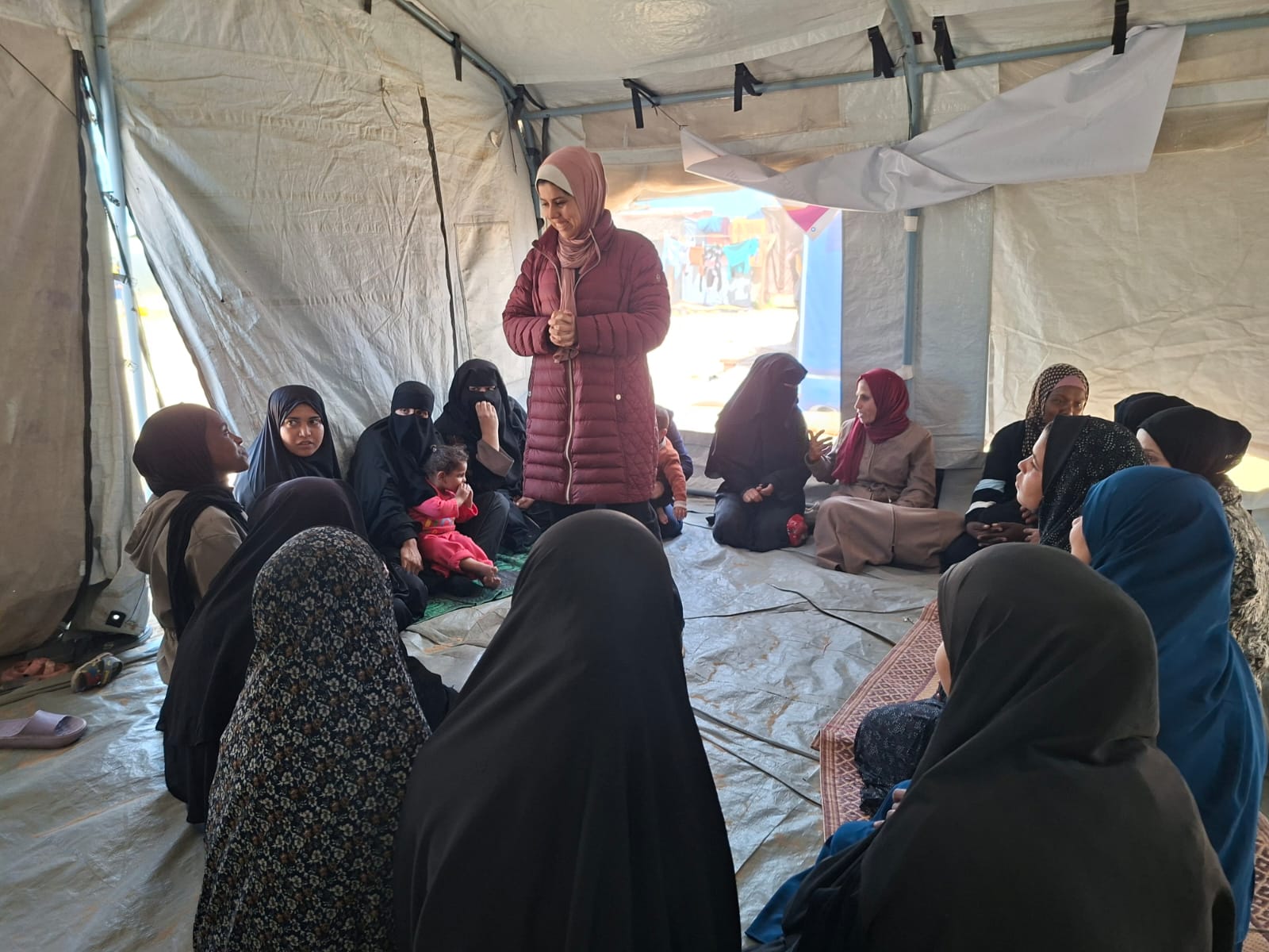 Cette session a été organisée par l’équipe UJFP, comme un espace différent du quotidien, un espace qui ne repose pas sur des solutions toutes faites, mais sur la présence, l’écoute et le partage. Dans un coin du camp, 25 femmes vivant sous les tentes se sont réunies pour une rencontre qui ressemblait à une tentative collective de reprendre leur souffle.
