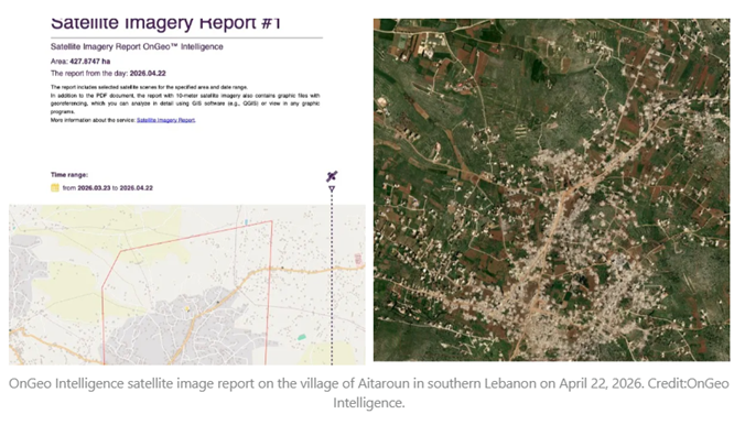 Lili Gerges, 25 avril 2026. – Ali Murad savait que l’armée israélienne avait lancé un bombardement violent sur sa ville natale d’Aitaroun, au sud du Liban, près de la frontière israélienne.. Comme il était impossible pour quiconque de s’y rendre pour vérifier l’état de sa maison familiale, il s’est tourné vers l’imagerie satellite pour tenter d’en savoir plus.